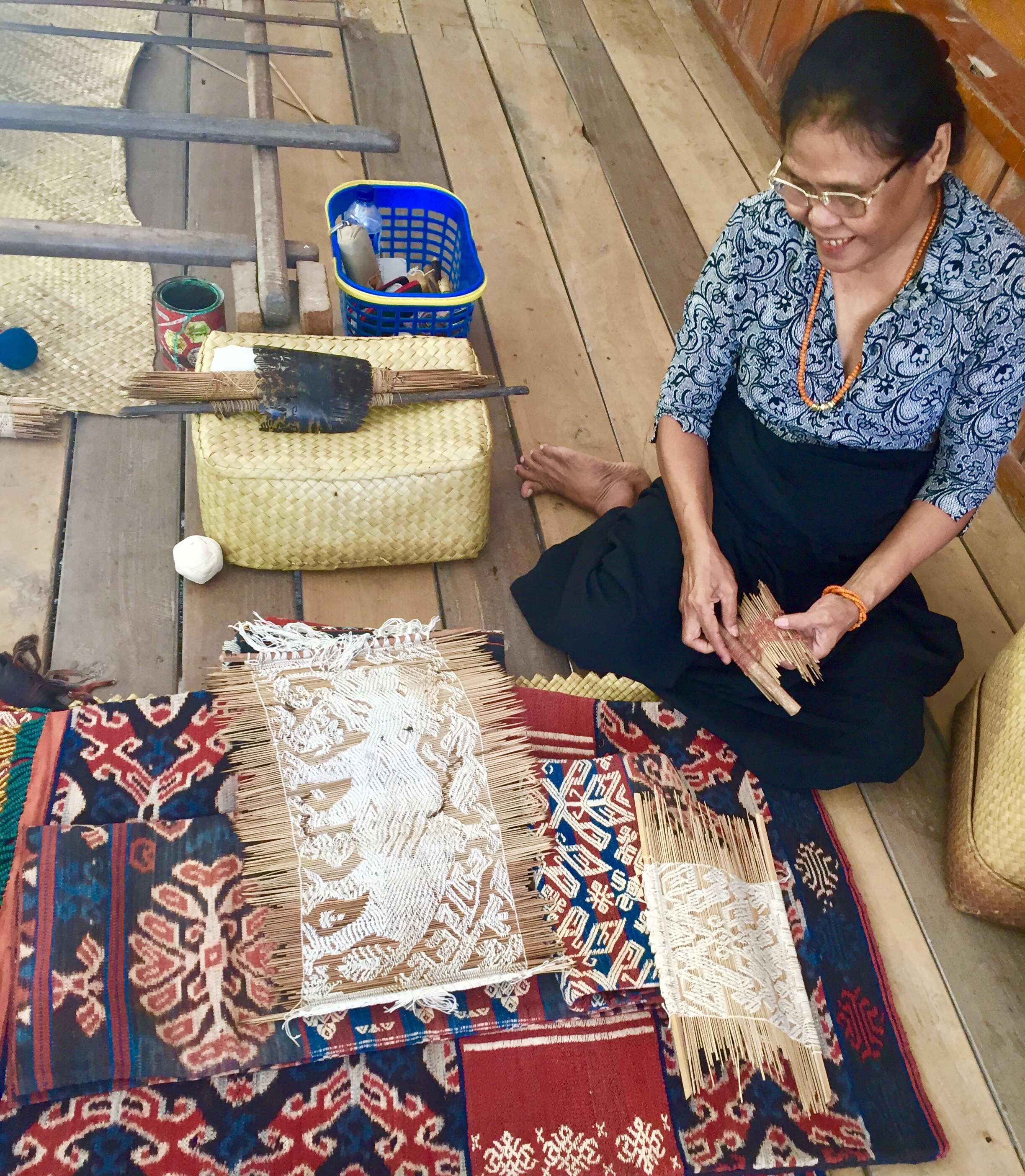 Seeing my enthusiasm for weaving she kindly unlocked wooden cupboards and chests and had old treasures brought out into the light. She showed us teaching tools-reed and cotton patterns for especially difficult raised pahikung weavings that she combines with regular ikat designs.