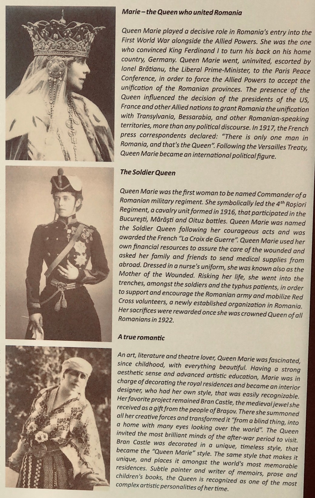She encouraged a love affair between the King’s adopted nephew and heir apparent Ferdinand and one of her favorite ladies in waiting. For that both women were exiled for years from the court and young Ferdinand was sent to Europe to look for a suitable bride. The queen’s romantic name Carmen Sylva was her nom de plum, her real name being Pauline Elisabeth Ottilie Luise of Wied. Not very Romanian sounding, eh?