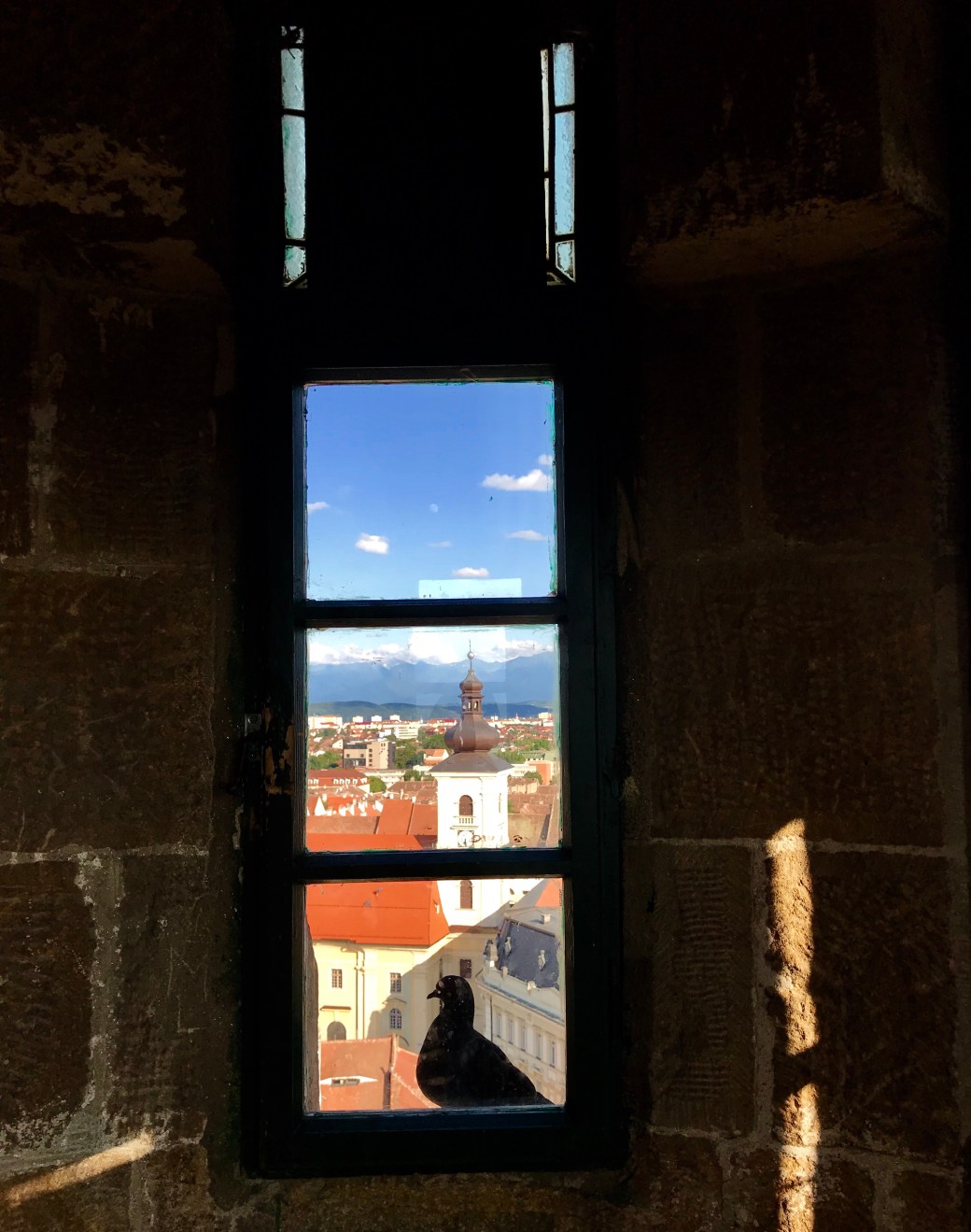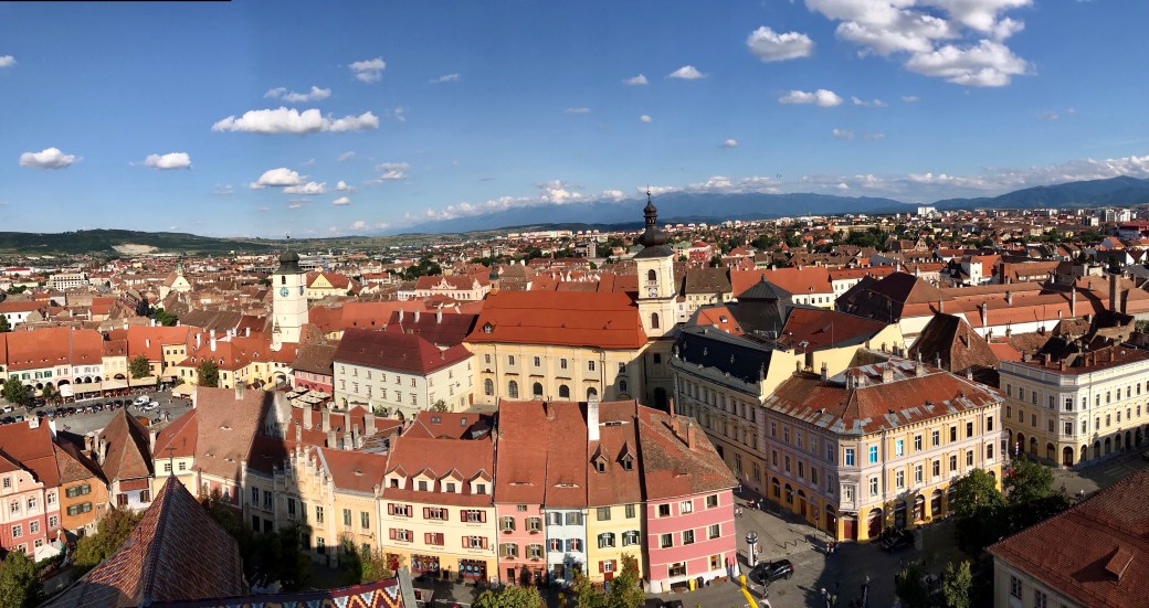 At the entrance to the Sibiu’s main Lutheran church tower we met a German lady who volunteered as a local guide. In retirement she came back to live modestly in her beloved home town. She kindly let us conquer few hundred stairs to reveal a beautiful view of Sibiu against Fagaras Mountains